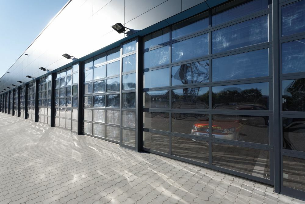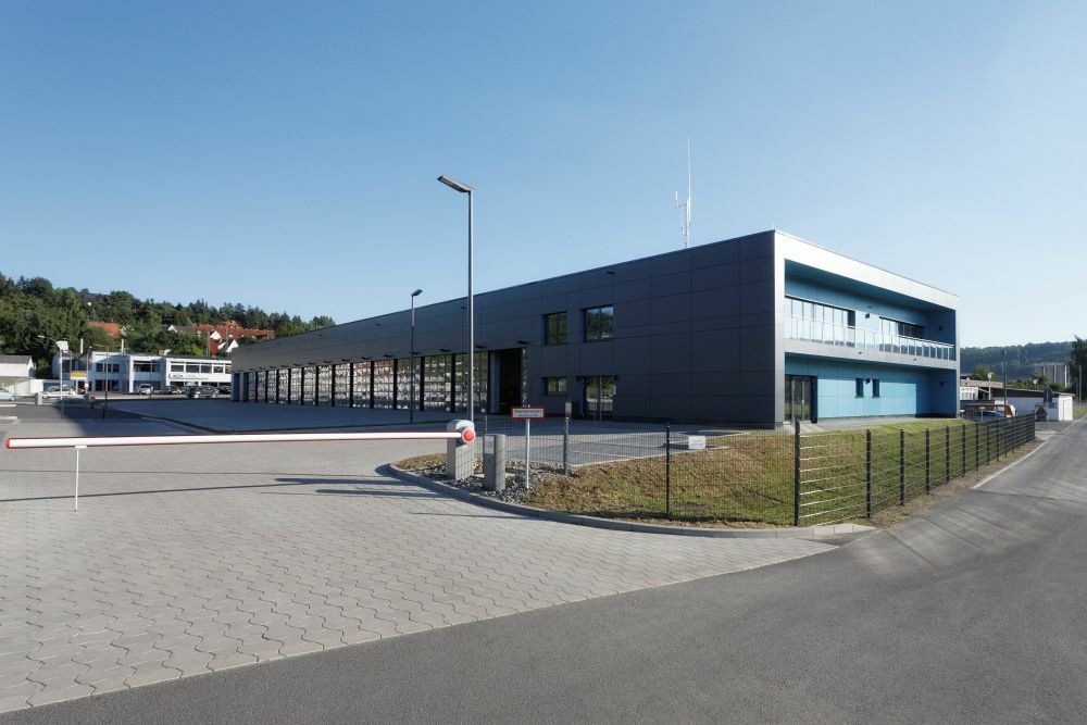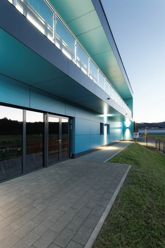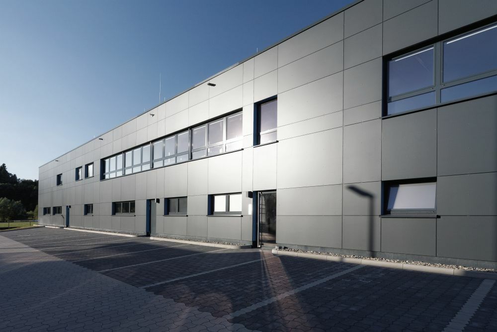 Als Fassadenverkleidung ist eine Vorhangfassade mit sichtbar genieteten/geschraubten HPL-Platten in einem mittleren Grauton vorgesehen. Die Fensterrahmen werden dem Fassadenfarbton angepasst, so dass ein harmonisches Gesamtbild entsteht. Dies gilt ebenso für die Toranlagen.