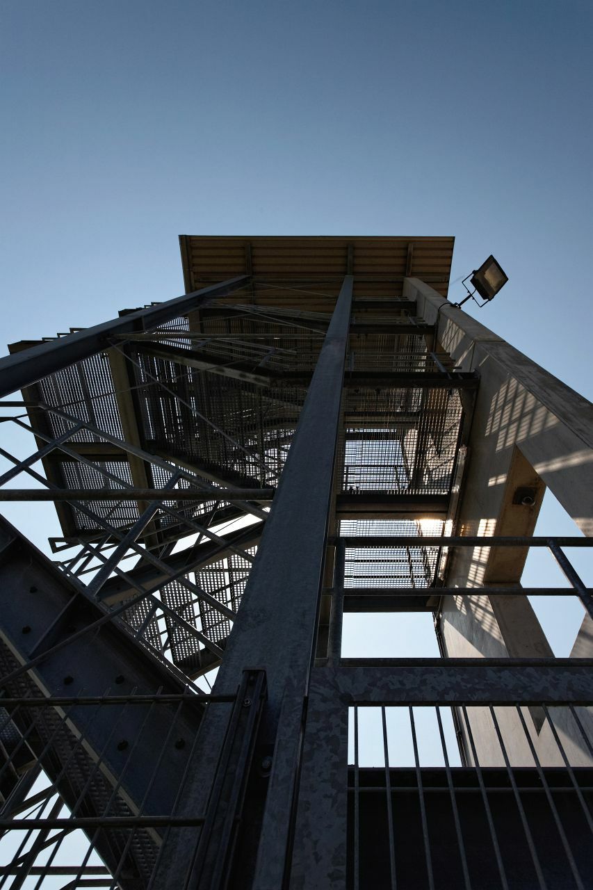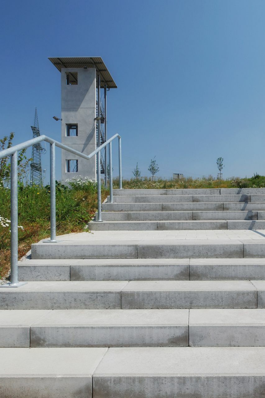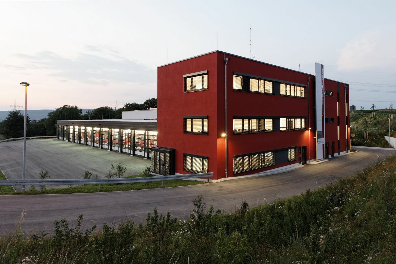 „Erwähnenswerte Randbedingungen des Grundstücks sind die starken topographischen Unterschiede auf dem Grundstück. Dazu gehören der angrenzende Teil des ehemaligen Steinbruchs und die vorgegebene Grundstückserschließung ausschließlich über die „Neue Bahnhofstraße“. Die Ausrichtung des Gebäudes folgte der bestmöglichen funktionalen Anbindung für die Einsatzkräfte. Dabei wurde berücksichtigt, dass der Feuerwehrstützpunkt von den vorbeiführenden Straßen gut wahrgenommen werden kann, da er schon aufgrund der Grundstückslage das „Tor zur Stadt“ bildet. Der Übungsturm als skulpturale und funktionale Landmarke unterstreicht diese Bedeutung zusätzlich.