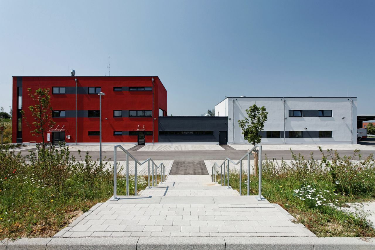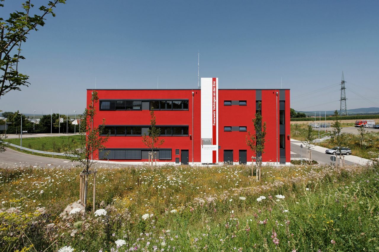 Das Feuerwehrhaus ist mit den Funktionsbereichen in vier Gebäudeteile gegliedert, die die inneren Funktionen außen widerspiegeln: