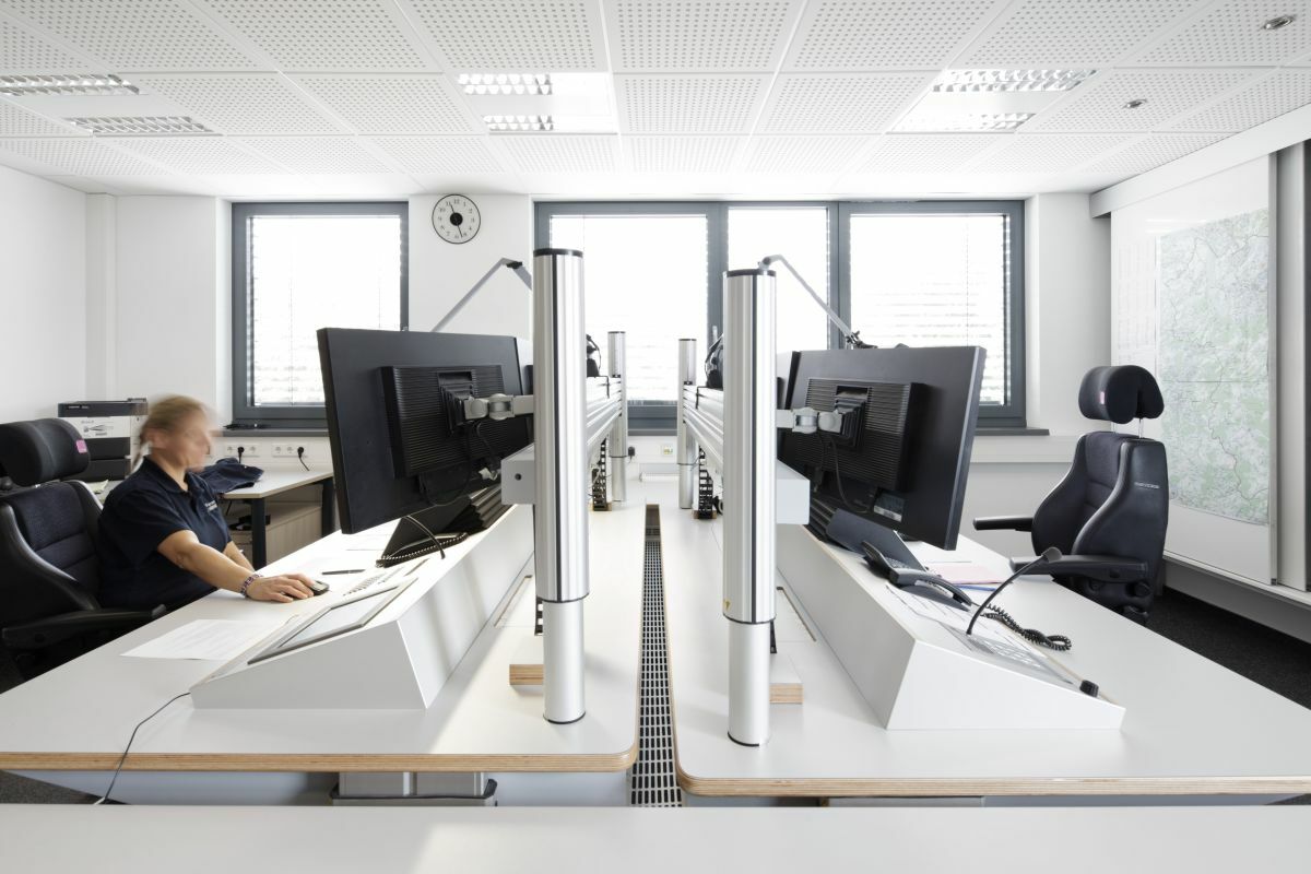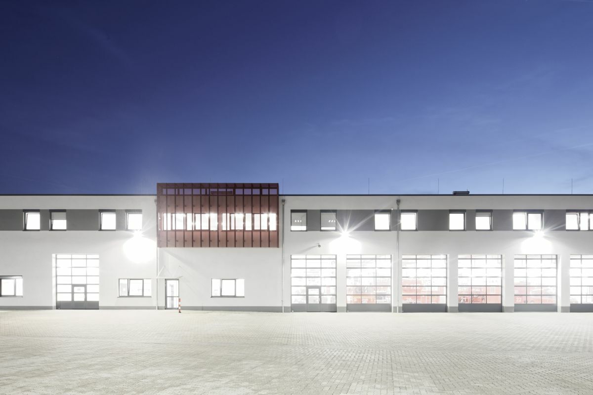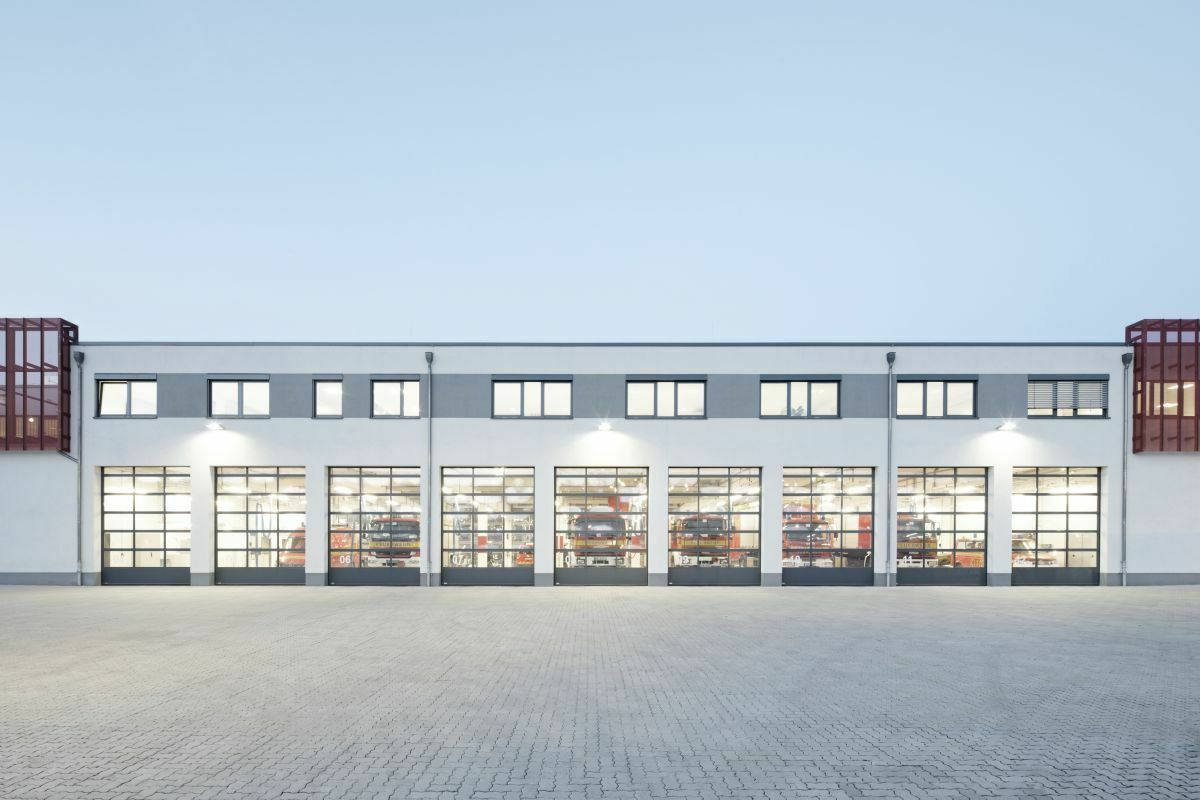 Die neue Feuer- und Rettungswache besteht aus einem kompakten Hauptbaukörper, der im EG die 18 Einsatzfahrzeuge des Brandschutzes und der Gefahrenabwehr aufnimmt und in einer zweiten Halle die des Rettungsdienstes. Im OG sind die Funkeinsatzzentrale, Ruhe- und Aufenthaltsbereiche sowie Schulungs- und Verwaltungsräume angeordnet. Ein zweiter Baukörper nimmt die Werkstatt- und Lagerräume auf. Auf der Dachfläche wurde eine Solaranlage für die Brauchwassererwärmung für den Eigenbedarf installiert.